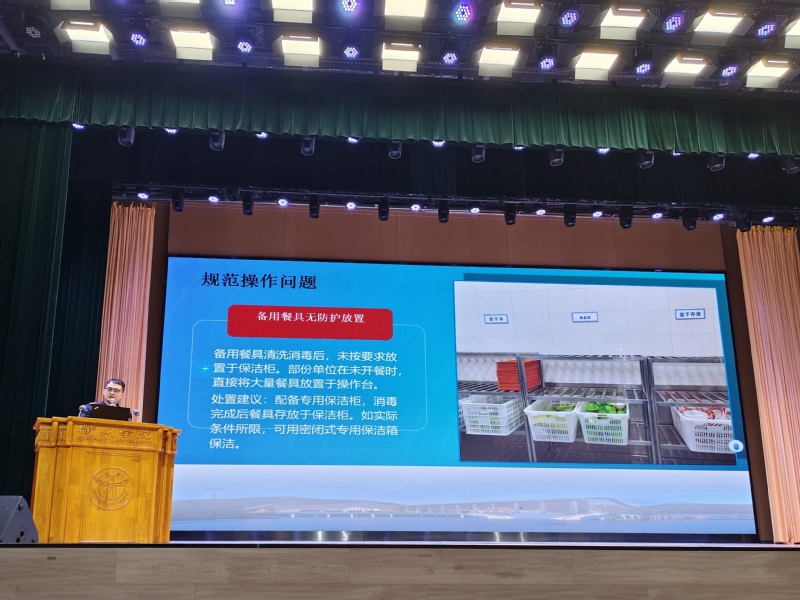 本次培训特邀市场监督管理局智慧新城分局行政执法队直属队专职副队长姜腾来校主讲。姜队长深耕食品安全领域,兼具扎实的理论功底与丰富的实践经验。他以详实案例为引,用生动语言和明确标准,从学校食品安全相关法律法规、食材禁用慎用品种、实际常见问题及舆情事件处置等方面,为大家进行了系统全面的讲解。重点强调了食品安全各环节流程中的关键控制点:从原料采购的严格把关、储存环节的规范管理,到加工烹饪的精准操作、餐具消毒的标准执行,再到个人卫生的细致要求,全面覆盖了食堂工作的全链条。